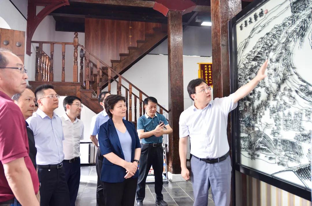 ? 調研組一行首先來到園區益新面粉大樓,園區功能性黨委書記、總經理卞國琛在鐵畫作品《百年大礱坊》前向調研組介紹百年前蕪湖青弋江兩岸繁榮興盛的景象,講解益新面粉廠131年的風雨歷程,以及大樓如何整修與保護。調研組在大樓四樓駐足觀賞原華中師范大學校長章開沅老先生的題詞,上面寫道:“飲水思源,日新又新”“百年益新面粉廠,日新礱坊科技園”。